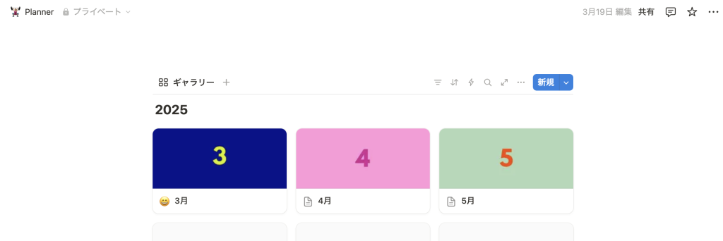 ちなみに私は計画するのが好きなので、目標やtodoリストを月ごとに分けてページを作成して、こんな感じにギャラリービューにしている!